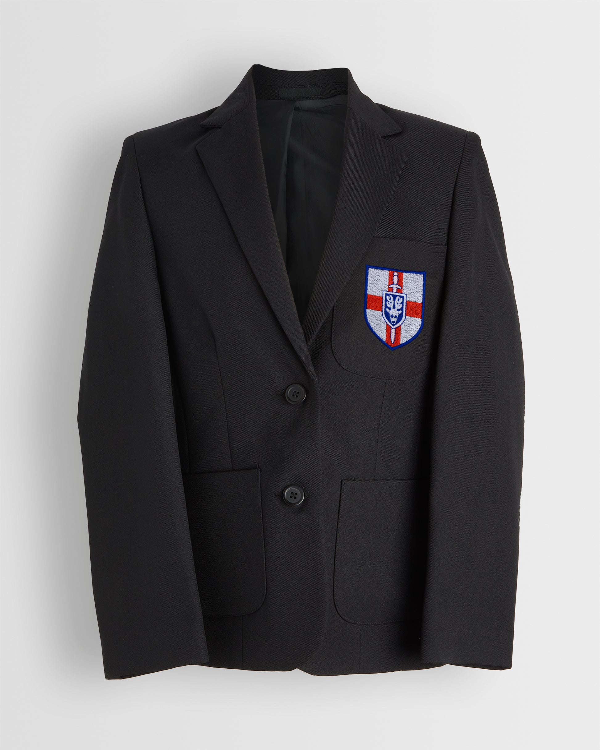 Black girls blazer with embroidered school emblem.